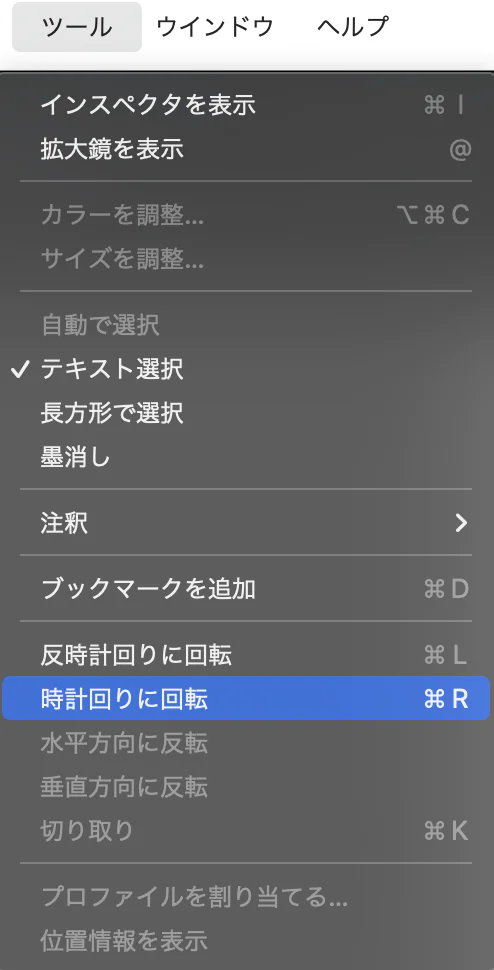 続いて、メニューの「表示」から「時計回りに回転」をするだけです!