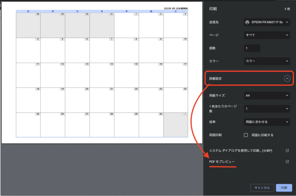 パソコン側の印刷設定ページが表示されたら、詳細設定をクリックして、PDFをプレビューを選びましょう。