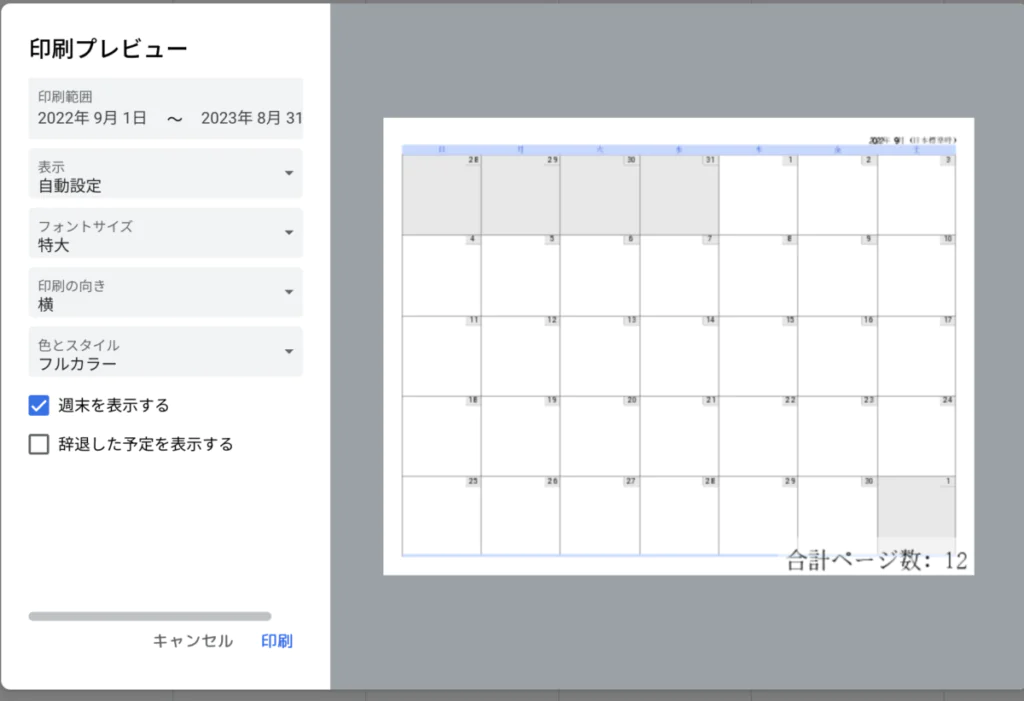 - 「フォントサイズ」と「印刷の向き」「辞退した予定を表示する」はそのままの意味です。